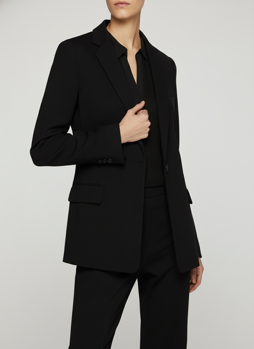 This black fitted blazer is a must-have for any professional wardrobe. Made with a single breasted design, it offers a sleek and polished look. The amazing fit and quality make it the perfect choice for any business setting. Elevate your style with this must-have piece.